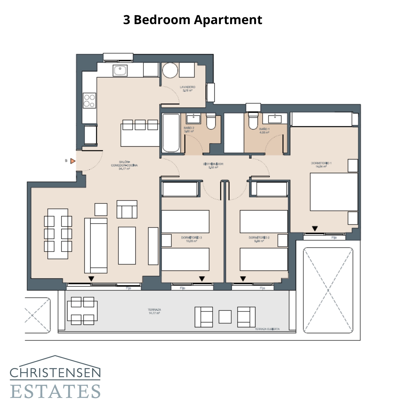 Planløsning for to-roms toppleilighet, med et fantastisk taksolarium for den ultimate private oasen.
